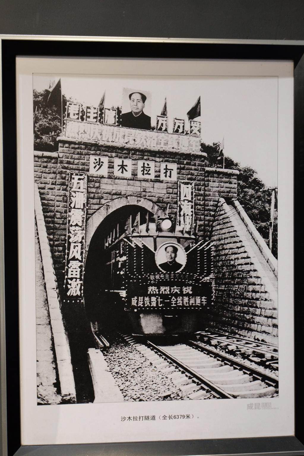在铁道兵博物馆,一张照片吸引了不少参观者驻足:一辆挂着“热烈庆祝成昆铁路‘七一’全线胜利通车”字样的火车,开出了沙木拉达铁路隧道(如今已改名为“沙马拉达铁路隧道”)。这个隧道是当时成昆铁路上最长的隧道,位于四川省喜德县内,被称为“空中隧道”“成昆之巅”,也被当地人称为“东方红”隧道,共有6379米,海拔约3200米,见证了成昆铁路修建最艰难的时光之一。