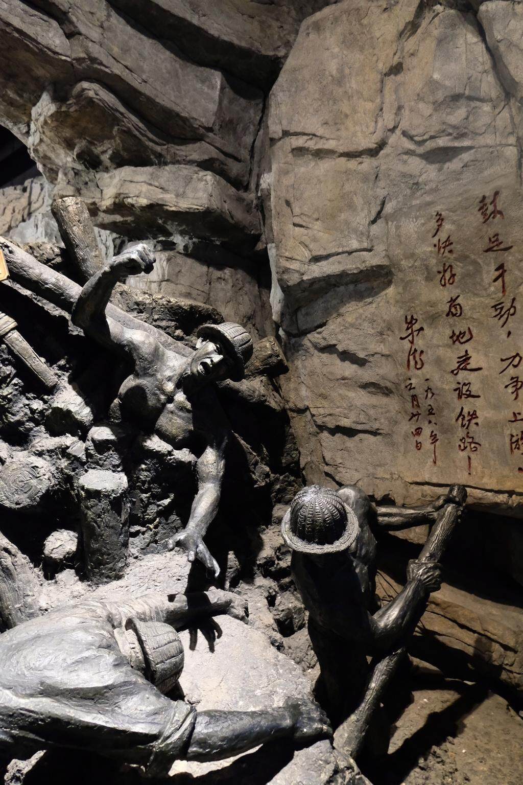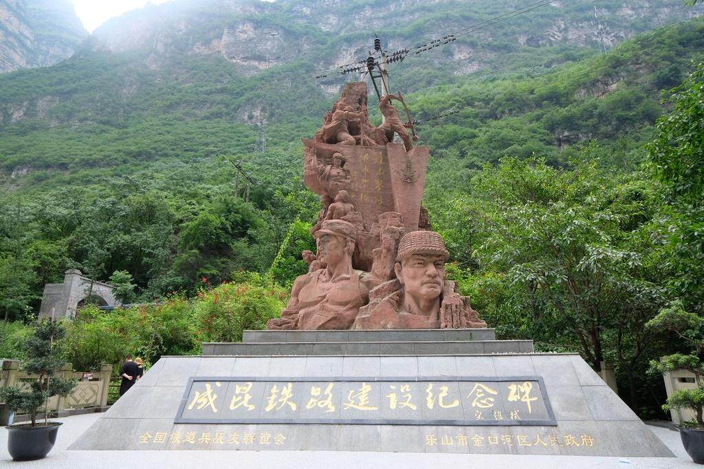 抬头仰望8.4米的纪念碑,碑身正面镌刻着“逢山凿路,遇水架桥”八个烫金大字,这是叶剑英元帅于1978年铁道兵成立30周年之际题写。整座纪念碑为山体的红褐色,大字下方是两位铁道兵战士富有立体感的头部雕像,一位头戴竹编头盔,目光深邃凝望远方;另一位身穿无袖背心,戴着短沿布帽微笑着。而大字上方的人物雕像逐渐变小,定格了铁道兵战士开路、挖山、点火把的典型动作,是这个群体的肖像缩影。