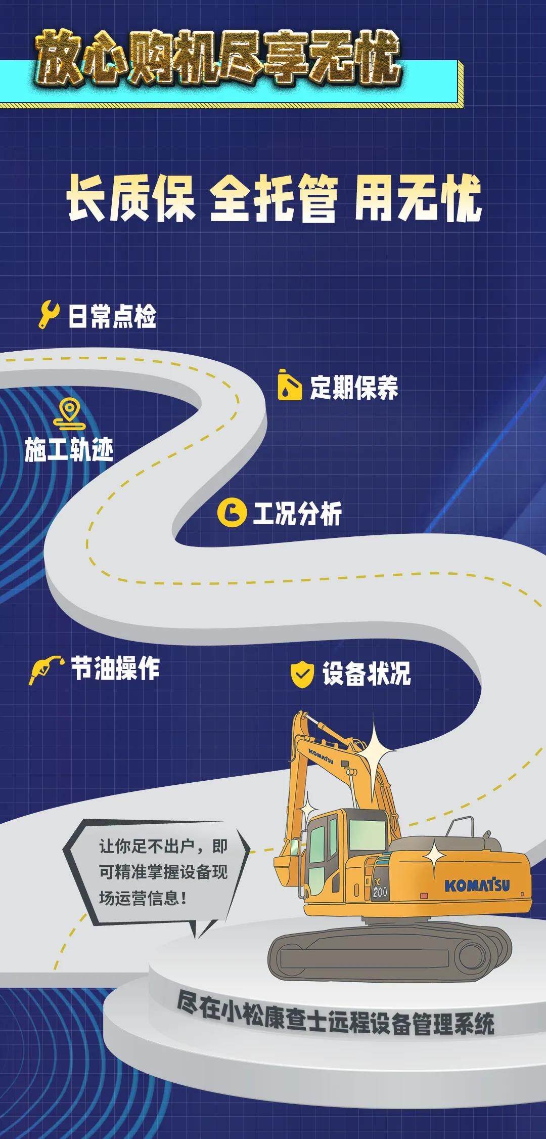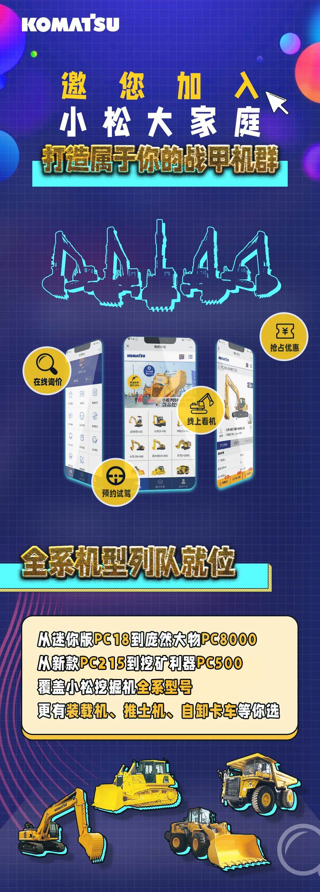 小松康查士远程设备管理系统,工程机械行业的人工智能,足不出户即可精准掌握设备现场运营情况。在这里,覆盖了小松挖掘机全系列型号,更有装载机、推土机、自卸卡车任你选。全新的线上购机,官方客服专业解答。
