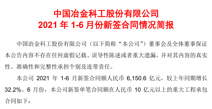 7月17日,中国中冶发布公告,2021 年 1-6 月新签合同额人民币 6150.6 亿元,较上年同期增长32.2%,有望上升至建筑央企新签合同额排行榜第四名!这样的好成绩,着实让人艳羡!