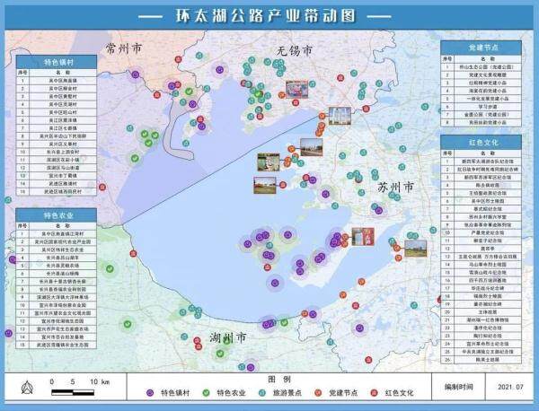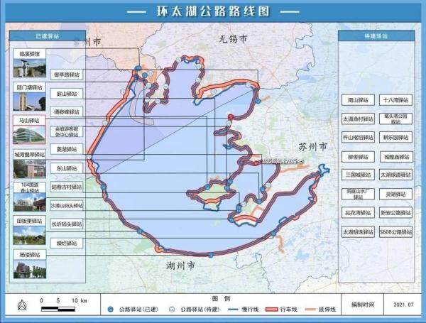 环太湖公路路线图、环太湖公路与国省干线路网共同构建起了“快进慢游”的环太湖公路网络,沿途设置具备停车休憩,饮水功能的公路驿站30余个实现环太湖公路驿站30分钟全覆盖。