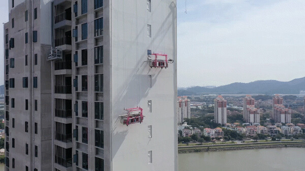 外墙底漆喷涂,依附环轨车作业,安全性高,效率约为人工喷涂的2倍,有效减小对施工人员造成的健康隐患,安全可靠,灵活高效。