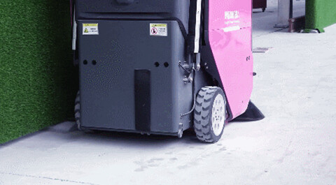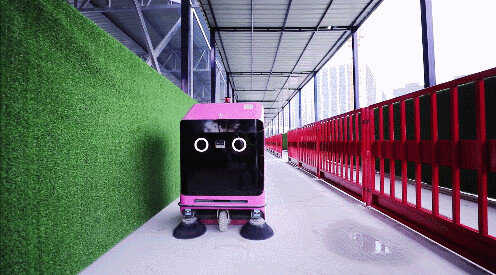 楼层清洁机器人,在一层的机器人专用通道处,楼层清洁机器人正缓缓行驶,自动执行施工现场,小石块与灰尘清理工作,所过之处地面变得洁净如新。