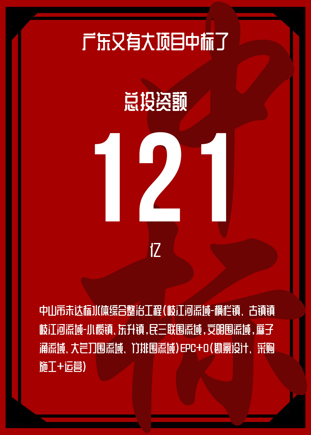 2021年7月20日,中山市未达标水体综合整治工程公布了中标结果,项目包括岐江河流域-横栏镇、古镇镇,岐江河流域-小榄镇、东升镇,民三联围流域,文明围流域,麻子涌流域、大芒刀围流域、竹排围流域)EPC+O(勘察设计、采购、施工+运营等工程,总投资121亿元。
