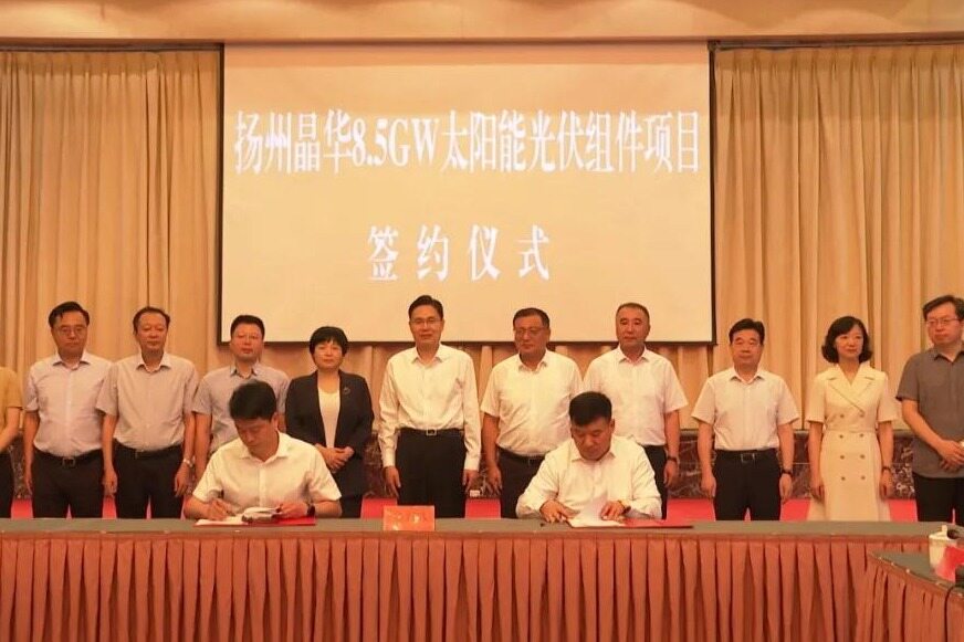 “智能制造+绿色建筑”的低碳现代化工厂是晶华新能源建设目标。2021年7月19日上午,晶华新能源8.5GW太阳能光伏组件项目签约仪式在扬州市江都区人民政府会议中心举行。江苏省江都高新技术产业开发区管理委员会书记彭松、晶华新能源董事长金健代表双方签约。