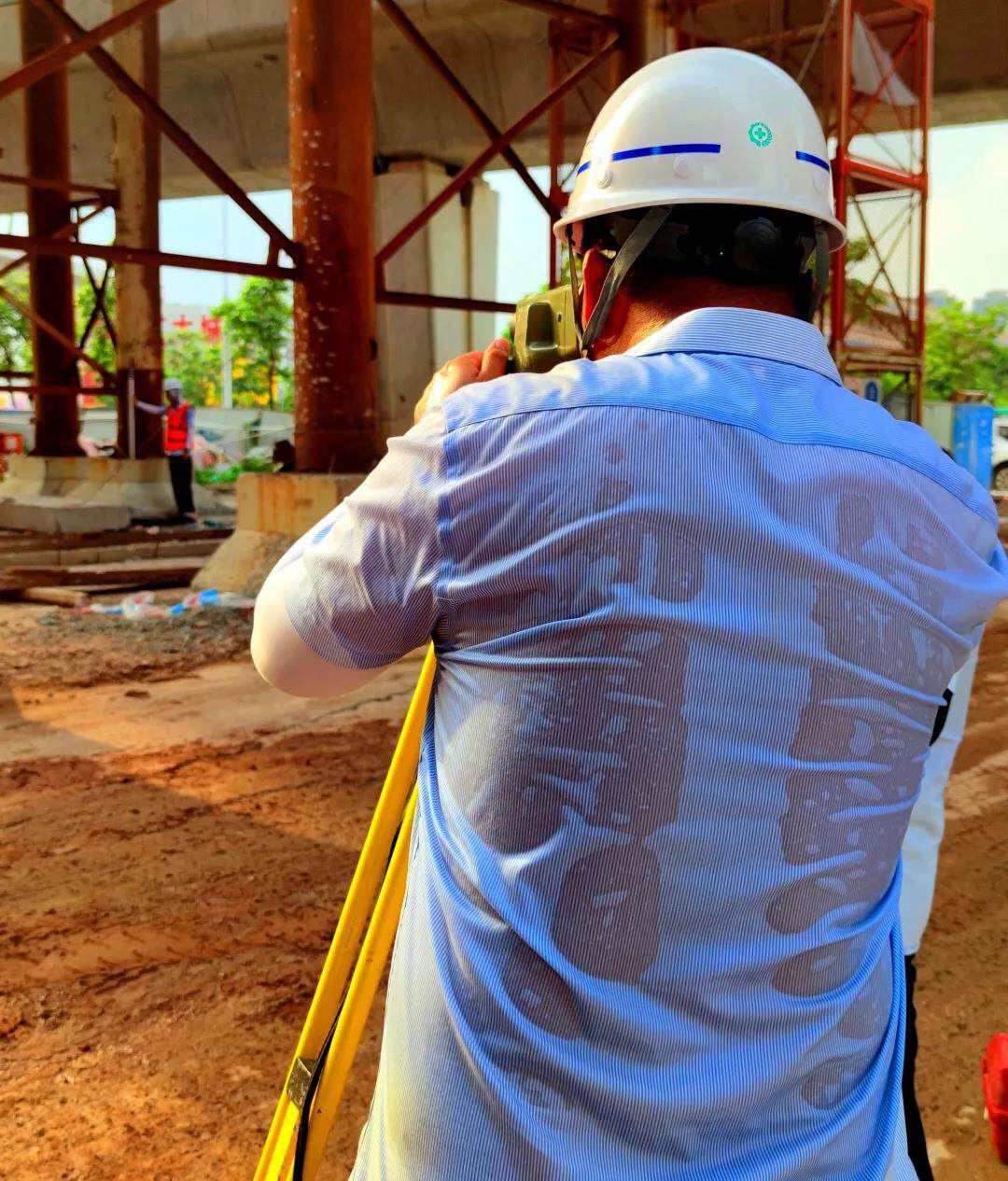 三十多度的高温下,汗水顺着脸颊流淌,衣服早已湿透,一线测量人员依然用心检测,确保数据准确、及时、有效,为工程质量保驾护航。