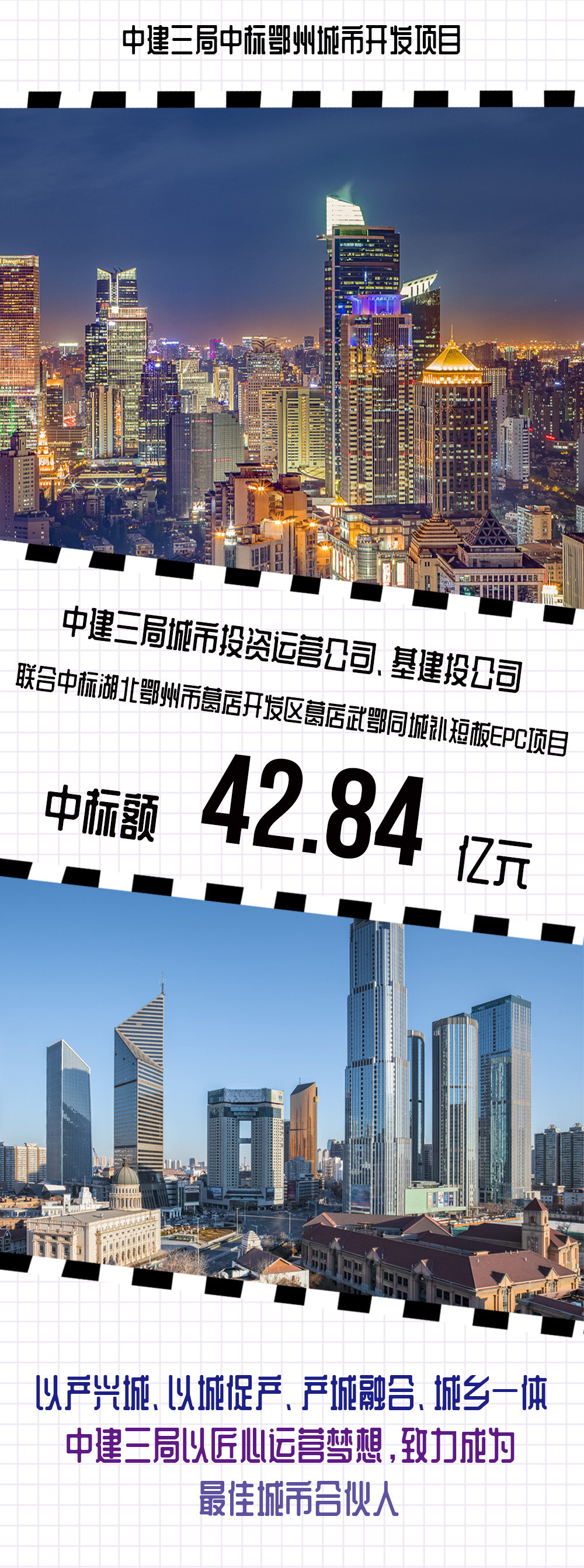 运营城市梦想,建设美丽中国。近日,中建三局城市投资运营公司、基建投公司联合中标湖北鄂州市葛店开发区葛店武鄂同城补短板EPC项目,中标额42.84亿元。
