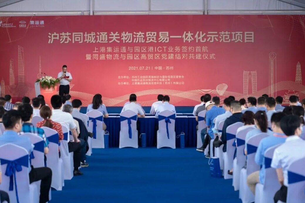 2021年07月21日,在苏州园区港隆重举行了上港集运通物流信息科技(苏州)有限公司与中国外运苏州物流中心有限公司合作开展苏州园区港ICT业务签约首航仪式和中共上海同盛物流园区投资开发有限公司总支部委员会与苏州工业园区高端制造业和国际贸易区机关总支部委会党建结对共建仪式。苏州工业园区管委会副主任孙扬澄、上海国际港务(集团)股份有限公司副总裁张欣、中国外运长江有限公司总经理崔仲谦、苏州市交通局领导、园区海关领导、园区高贸区管委会孟宏主任以及船公司、货主企业等嘉宾出席活动并见证了双方协议签约。