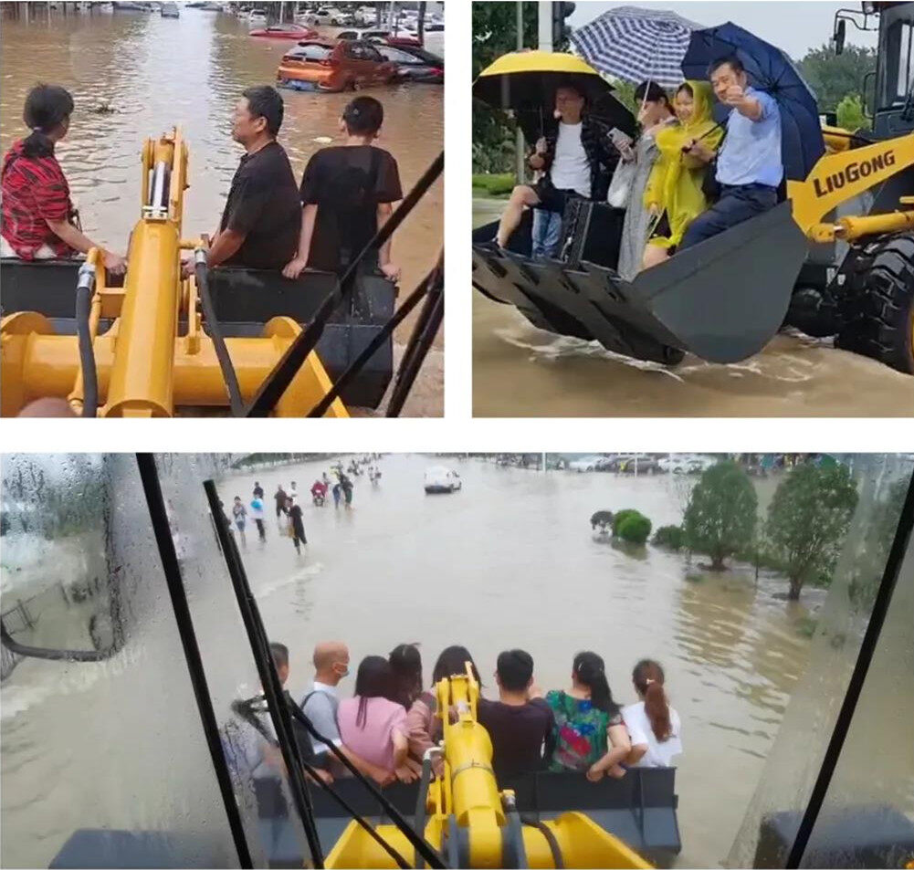 河南多地发生严重内涝,柳工装载机利用“身高”优势将城市居民运送到安全地带