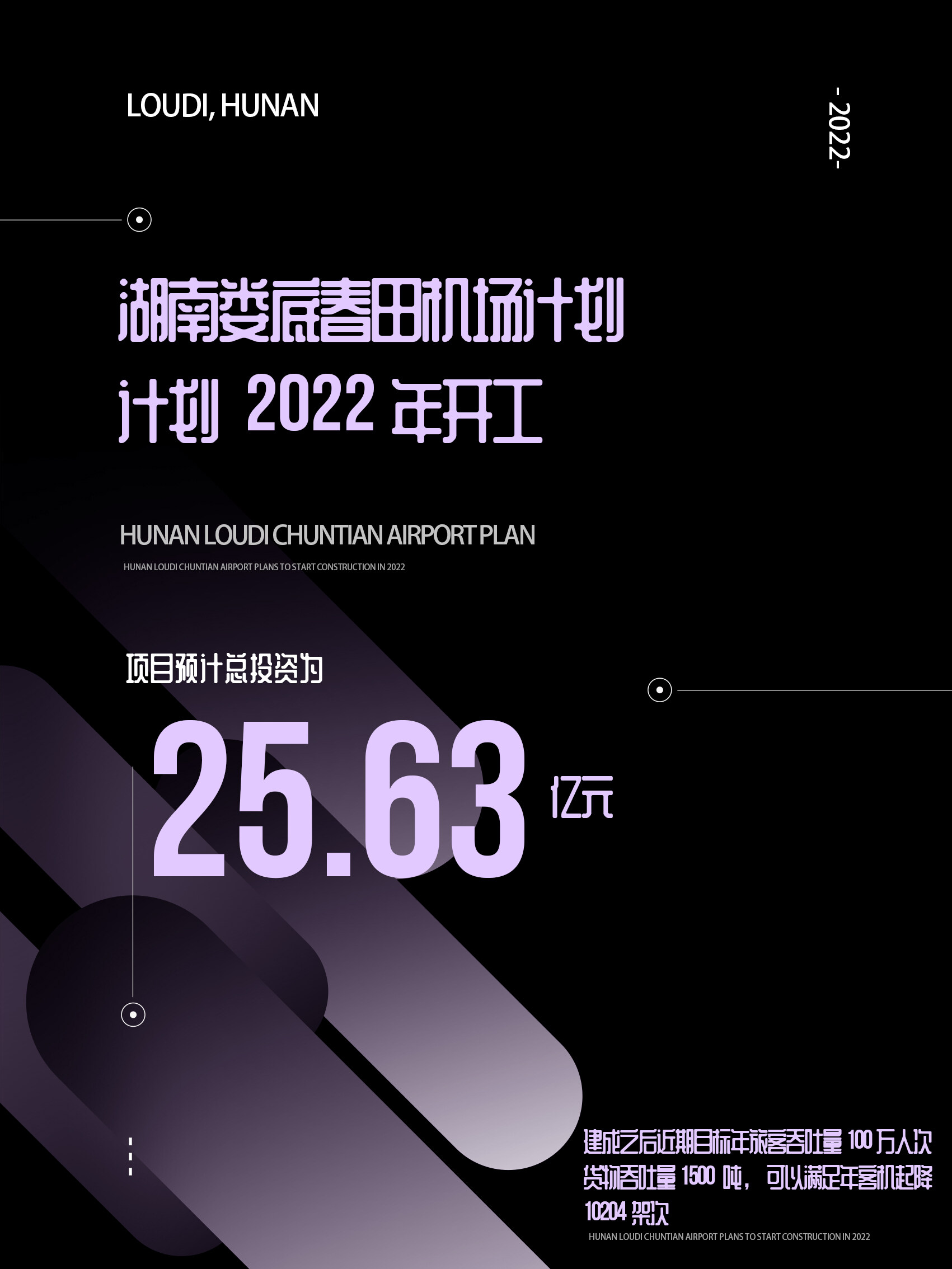 根据最新消息,该机场建设中包含的配套设施中,跑道长度建设为2600米,航站楼建设9000平方米,还有停机坪和机位建设,塔台和货物中转中心的建设。项目预计总投资为25.63亿元,计划2022年开工,力求在2023年底可以通过试飞,争取在2024年开通航运。这座机场的建设将主要服务于娄底市周边地区的旅游、公务、商务和探亲的航空出行需求,还兼顾抢险救灾和通用航空业务的发展。建成之后近期目标年旅客吞吐量100万人次,货物吞吐量1500吨,可以满足年客机起降10204架次。