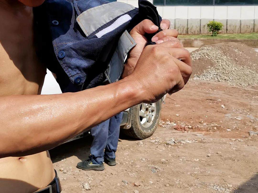 入伏后,广西柳州持续高温,7月16日,南方电网柳州供电局工作人员顶着高温进行带电作业,全力保障客户用电,安心度夏。图为作业结束后,供电人员的衣服已经被汗水湿透。