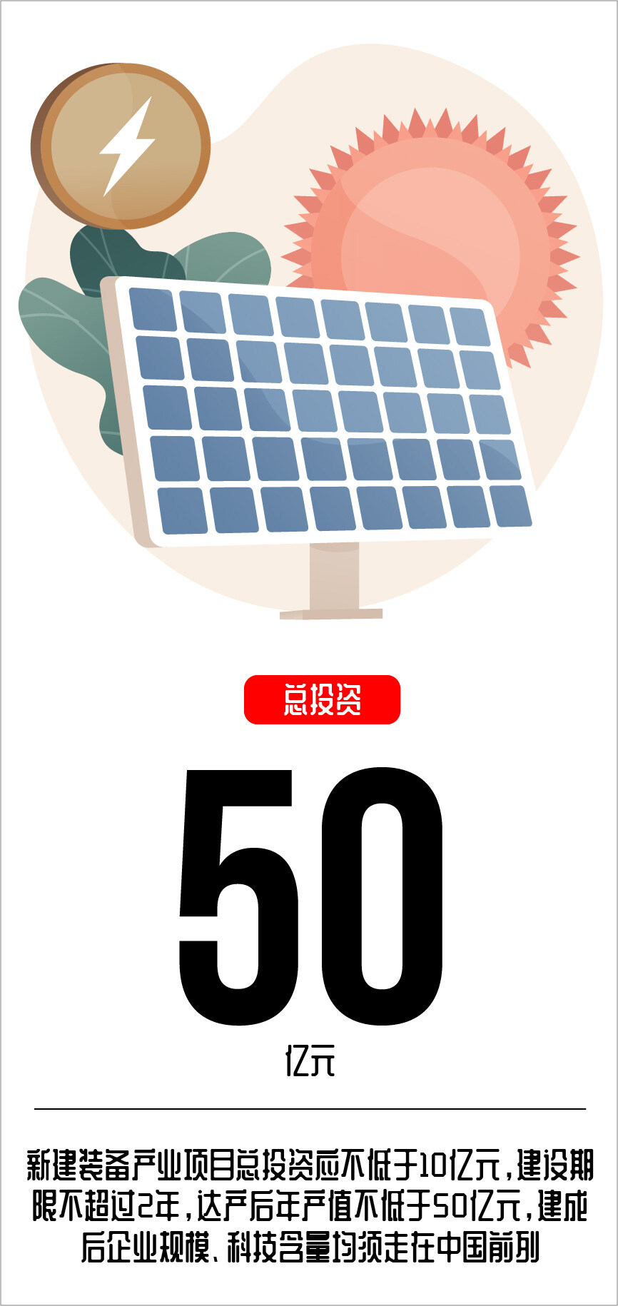 意见稿指出产业发展配套的新能源项目。指为技术水平和销售总额位于行业全国前列的企业在我省投资新建新能源装备制造产业(包括风电、光伏、氢能、化学储能装备等相关配套产业)配置的新能源项目。新建装备产业项目总投资应不低于10亿元(货币投资,下同),建设期限不超过2年,达产后年产值不低于50亿元,建成后企业规模、科技含量均须走在中国前列。