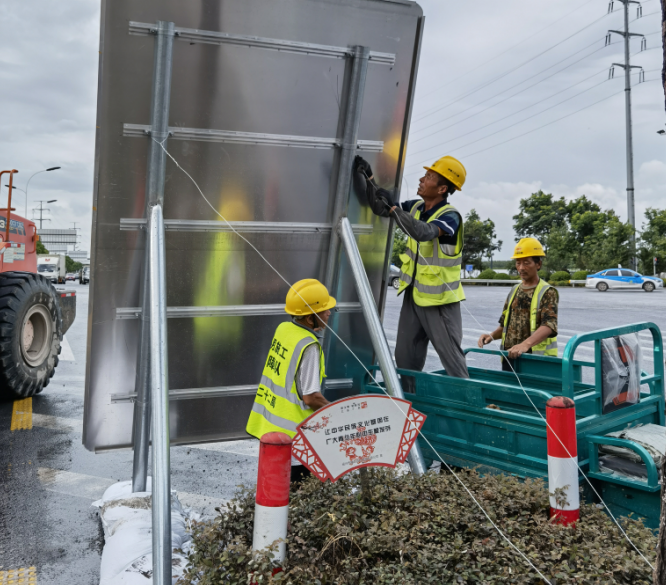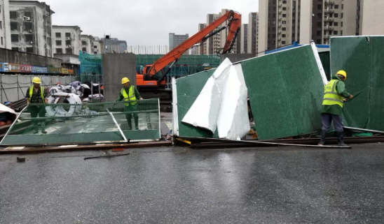中铁二十二局集团绍兴308省道项目部组织人员对施工现场路边受大风导致脱落的围挡、指示牌、广告牌及时清理,全力保障市民正常出行。
