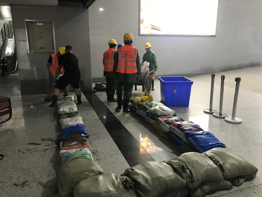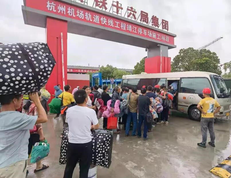 中铁十九局集团杭甬项目部安排专人对临水区域进行24小时盯控,在每个低洼地带安放抽水泵,随时准备抽排水,将现场施工人员全部转移到安置点宾馆。他们还将施工现场所有标识标语及各类宣传图牌全部拆除,确保施工现场安全。