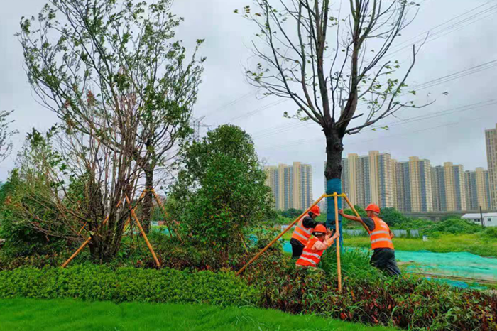 在江苏扬州,中国铁建投资建设运营的扬州湾头玉器特色小镇文旅项目对全部绿化树木、杆线及围挡进行加固,高压线下防尘网已全部锚固,所有构筑物临边材料及物资全部进行清理、转移,应急排水水泵等物资设备已全部就位。