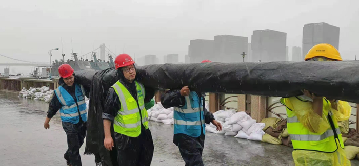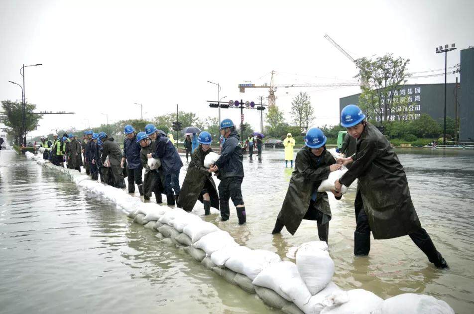 台风前,中铁十五局集团杭甬项目组织200名员工参加宁波市镇海区抗台风海堤加固抢险任务。建设者连续奋战10小时,完成堆码沙袋20000多袋,长度达1.5公里的抢险任务。受台风影响,宁波老外滩三江口潮位连续3天高水位,24日恰逢天文大潮,甬江水位不断提高,江水倒灌观景台阶,进一步威胁市区安全。25日一早,中铁十五局集团宁波房建项目部组织30名人员、4台车辆赶赴现场参与堤坝加固任务。
