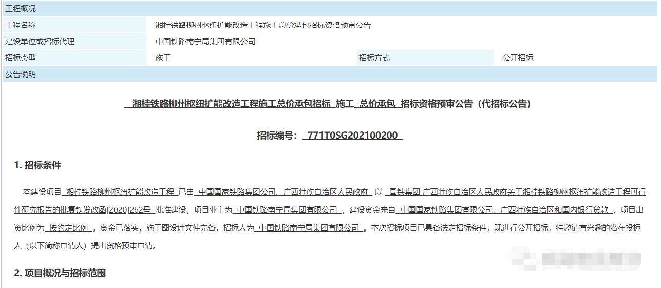 2021年7月22日,《湘桂铁路柳州枢纽扩能改造工程施工总价承包招标资格预审公告》发布,项目即将正式开工建设。根据招标公告,全线计划开工日期2021年11月1日,计划竣工日期2024年7月31日,工期2年9个月。