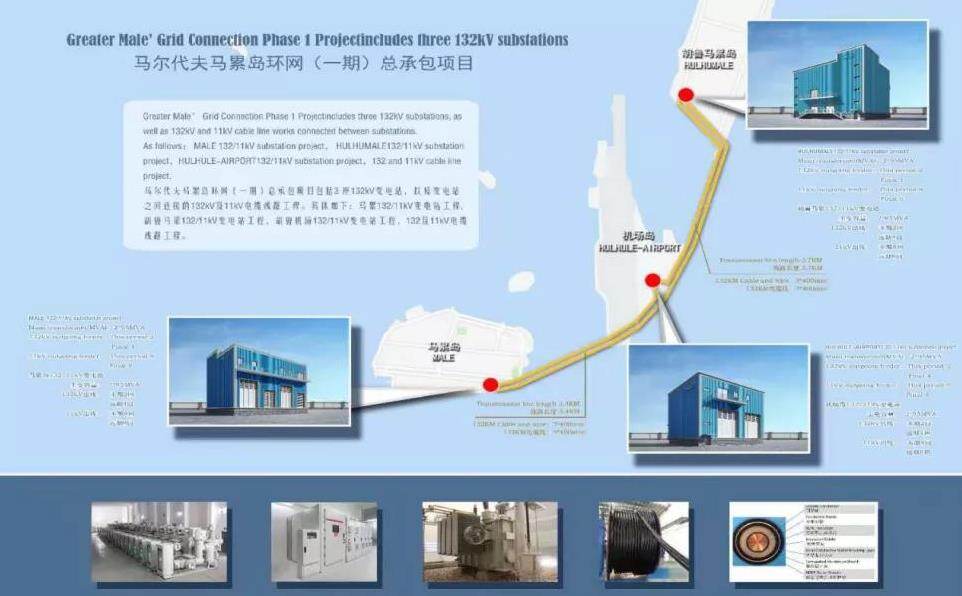 马累岛环网工程由马尔代夫首都马累岛、胡鲁马累岛、胡鲁机场岛三座132千伏变电站,三站之间的132千伏电缆线路,以及变电站与各岛发电站连接的11千伏电缆线路三部分组成。