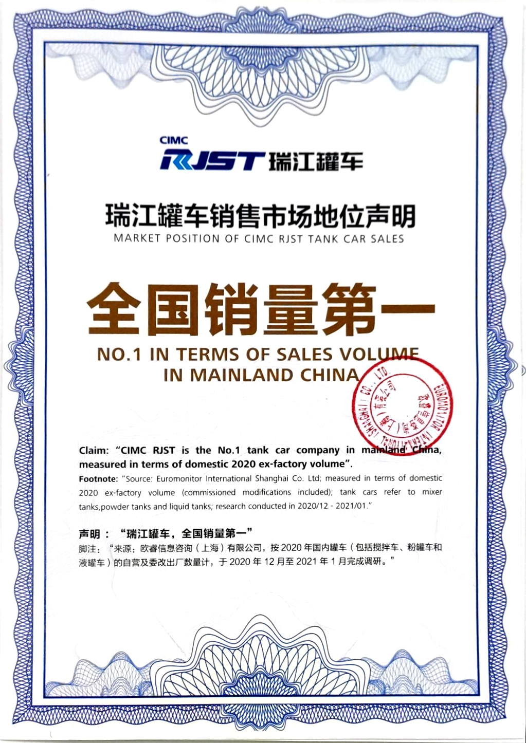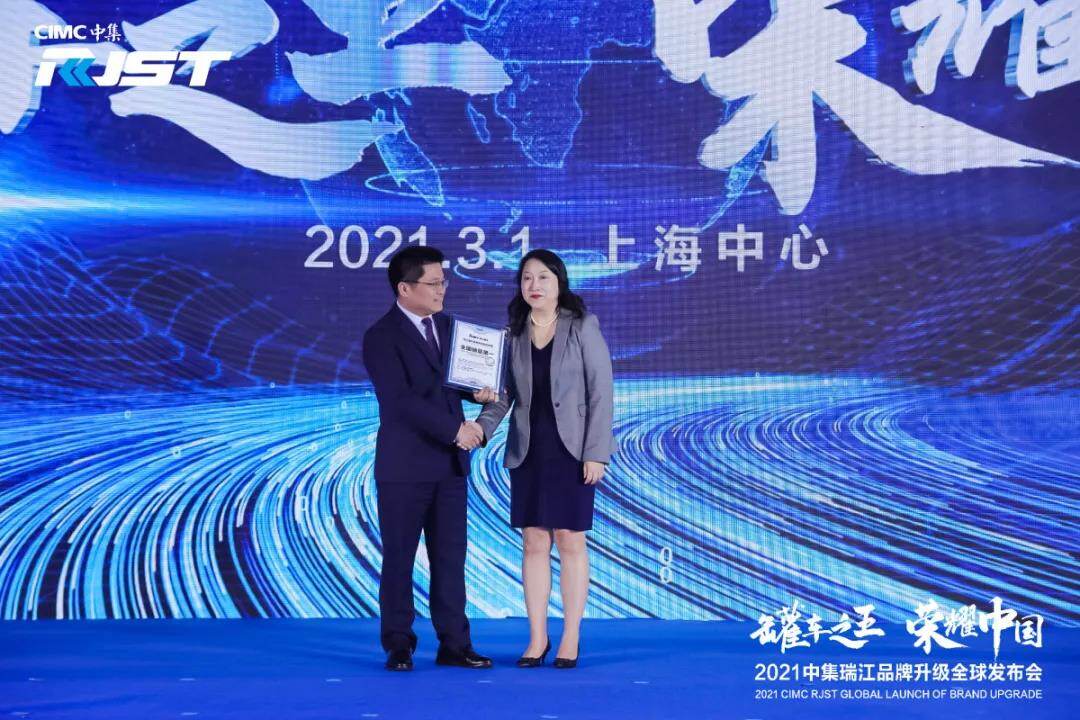 发布会上,全球知名调研机构欧睿信息咨询有限公司高级咨询总裁穆愔女士为中集瑞江授予“瑞江罐车全国销量第一”权威证书,并致贺词。由此,中集瑞江销量市场地位获得正式认可。