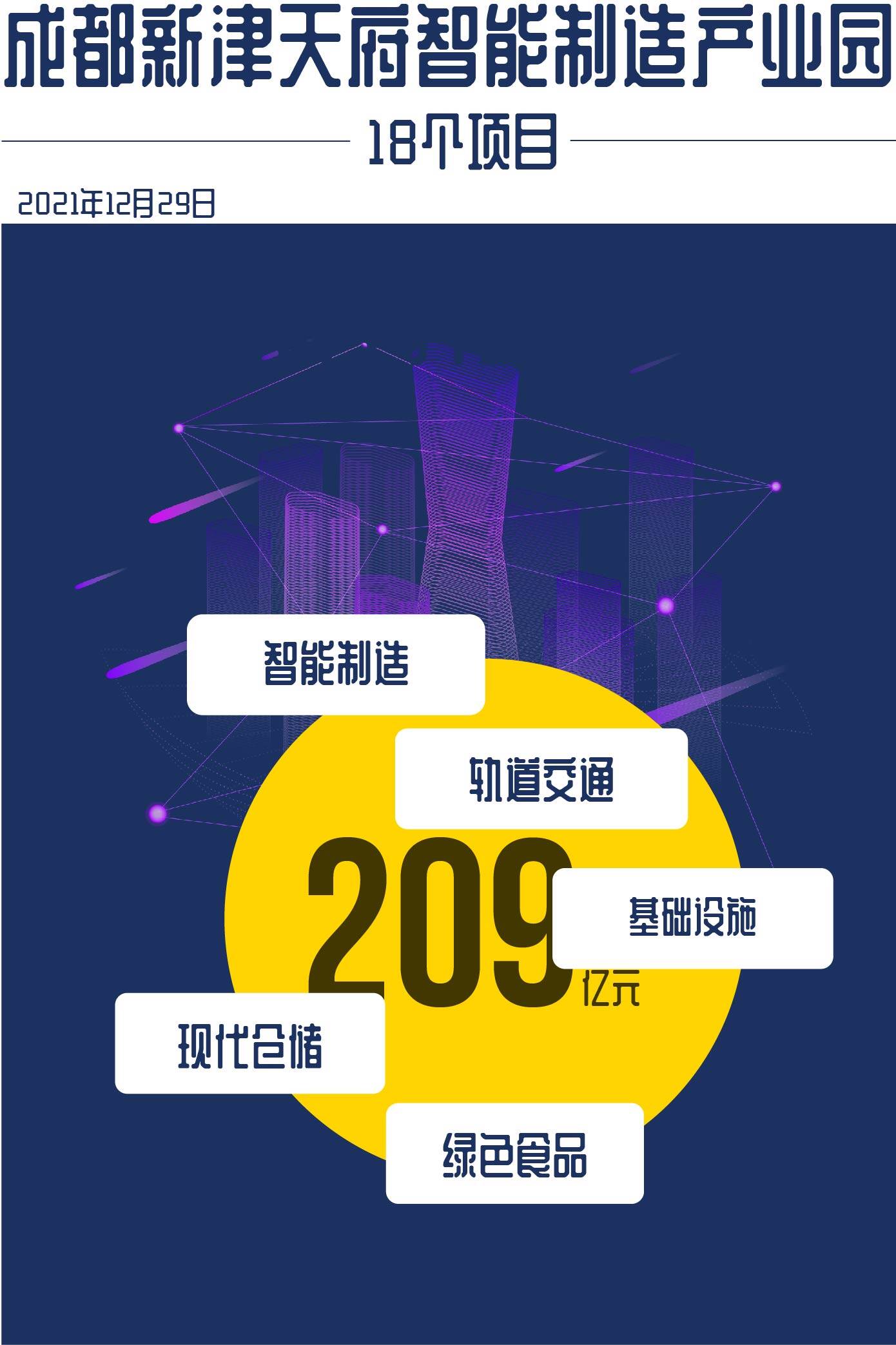 2021年12月29日,成都市新津区天府智能制造产业园18个重大项目集中开工,总投资209亿元,项目涵盖智能制造、轨道交通、现代仓储、绿色食品、基础设施等多个领域。