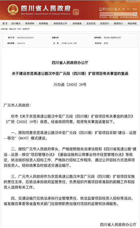 2020年5月29日,京昆高速汉中至广元段扩容工程有了最新进展,四川省政府官网发布了关于京昆高速公路汉中至广元段(四川境)扩容项目的批复,省政府原则同意京昆高速公路汉中至广元段(四川境)扩容项目采取建设—运营—移交(BOT)模式建设。