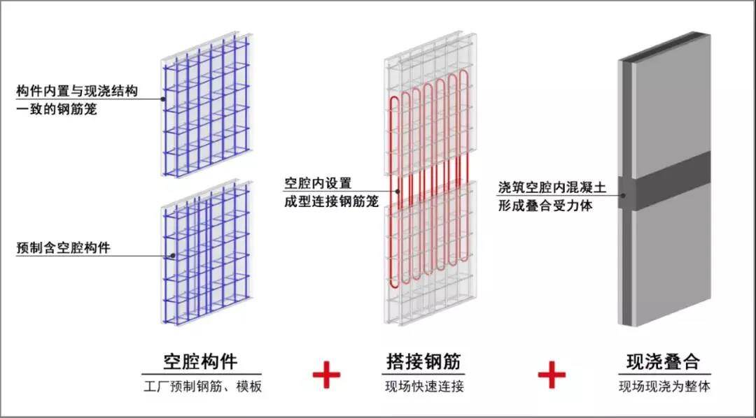 据了解,SPCS 3.0结构技术体系以“空腔+搭接+现浇”为核心,通过工厂预制含钢筋笼的空腔构件,代替了现场绑钢筋、支模板的工作,大量减少了现场施工量,对过去复杂的施工工序进行简约。其次,空腔内安放成型连接钢筋笼,通过搭接即可实现预制构件间的连接,较传统构件而言,操作便利且效率更高。此外,空腔内浇注混凝土,形成叠合受力体,确保整体安全。