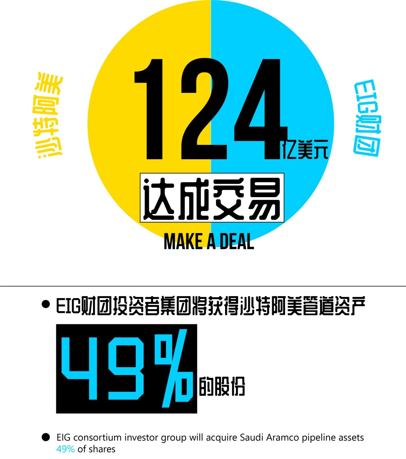 2021年4月9日,沙特阿拉伯能源巨头宣布,沙特阿美与以EIG Global Energy Partners为首的财团投资者达成了一项124亿美元的交易,两家公司表示,该投资者集团将获得沙特阿美管道资产49%的股份。