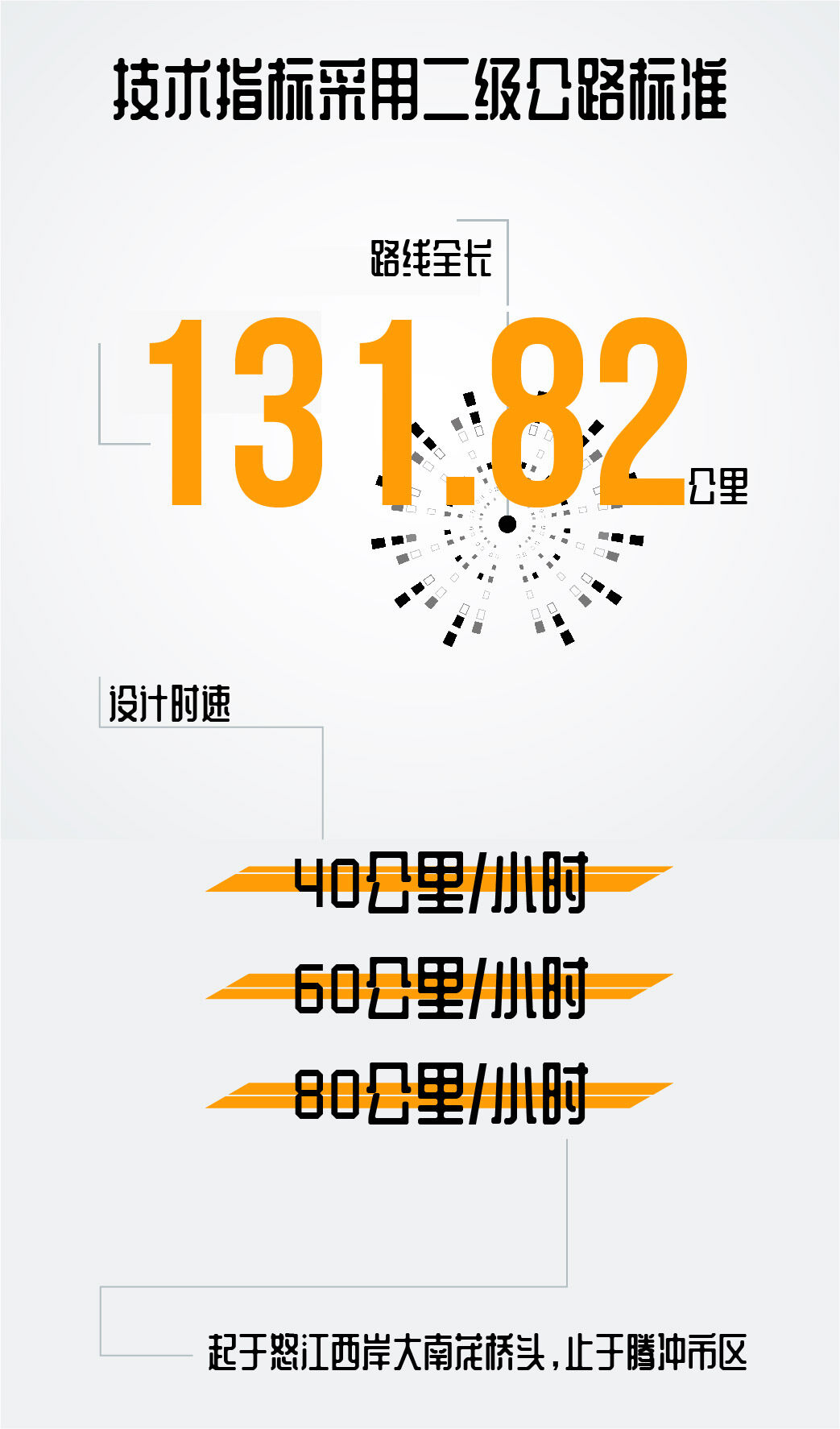 腾冲至泸水二级公路路线全长131.82公里(新建段49.97公里,改扩建段81.85公里),怒江州泸水市境内30.6公里;保山市境内101.221公里(其中:隆阳区53.906公里,腾冲市47.315公里)。起于怒江西岸大南茂桥头,止于腾冲市区。技术指标采用二级公路标准,设计时速分别为40公里/小时、60公里/小时、80公里/小时。项目批复概算投资57.97亿元,腾冲段概算投资23.96亿元。